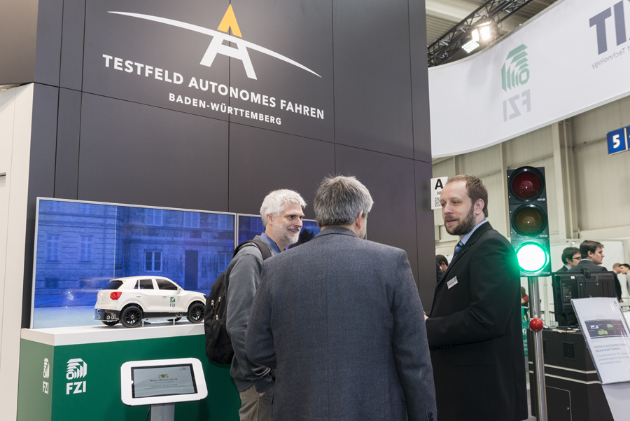 Mehr Sicherheit bei weniger Spritverbrauch und Zeitersparnis – mit einer virtuellen Testfahrt durch die Stadt Karlsruhe gaben das FZI Forschungszentrum Informatik und das Karlsruher Institut für Technologie (KIT) einen Ausblick auf Chancen und Möglichkeiten des autonomen und vernetzten Fahrens, wie sie in Zukunft auf dem Testfeld Autonomes Fahren Baden-Württemberg ausgelotet und erprobt werden. Am Demonstrationsaufbau mit Modellfahrzeug und Ampel konnten Messebesucher die Kommunikation zwischen vernetztem Auto und Signalanlage beobachten. Diese geschieht nicht nur über Lichtsignale und optische Sensoren, sondern auch über Funk. So wird das sich nähernde Gefährt schon während der Anfahrt über den Status der Ampelanlage informiert und kann seine Manöver darauf abstimmen, wie zum Beispiel die Geschwindigkeit so drosseln oder erhöhen, dass unnötiger Energieverbrauch vor roten Ampeln verringert wird.