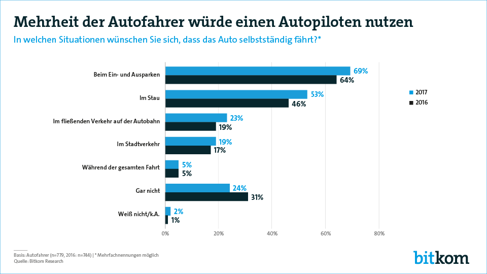 Fast jeder vierte Autofahrer (23 Prozent, 2016: 19 Prozent) ist dabei grundsätzlich bereit, seinem Auto im fließenden Verkehr auf der Autobahn die Kontrolle zu überlassen. 19 Prozent (2016: 17 Prozent) würden dies im Stadtverkehr tun und 5 Prozent (2016: 5 Prozent) sogar während der gesamten Fahrt. Am höchsten ist die Bereitschaft erwartungsgemäß in speziellen Fahrsituationen, also beim Ein- und Ausparken (69 Prozent, 2016: 64 Prozent) oder im Stau (53 Prozent, 2016: 46 Prozent). „Autonomes Fahren ist die Basis nahezu aller innovativen Mobilitäts-Angebote der Zukunft“, sagt Bitkom-Präsident Thorsten Dirks. „Es gibt ein großes Kundeninteresse an voll- und teilautonomen Autos. Wer heute in der Entwicklung der Fahrzeuge vorne mit dabei ist, hat die Chance, zum weltweiten Leitanbieter dieser Technologie zu werden.“